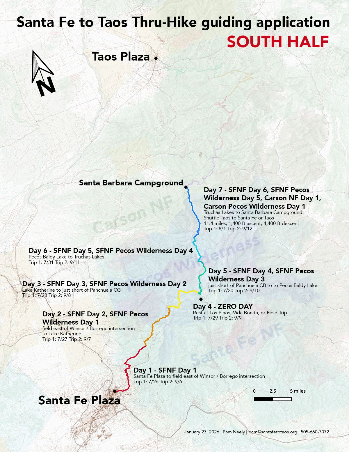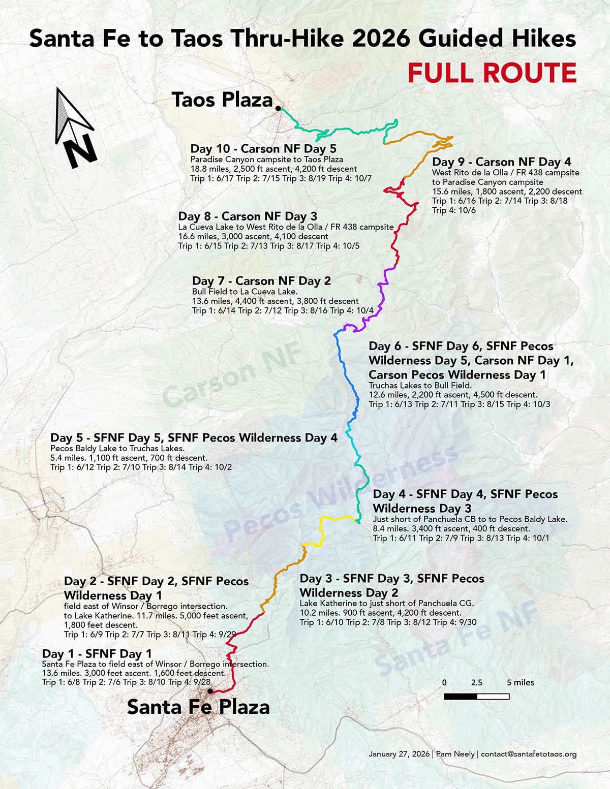 7 days total. Average of 12.6 miles and 2,700 feet of ascent per day. All trips leave Santa Fe Plaza on a Sunday morning and arrive in Santa Barbara Campground the following Saturday in the late afternoon. Each group will have nine guests plus two guides. Trips include shuttle service to either Santa Fe Plaza or Taos Plaza. $2,100.