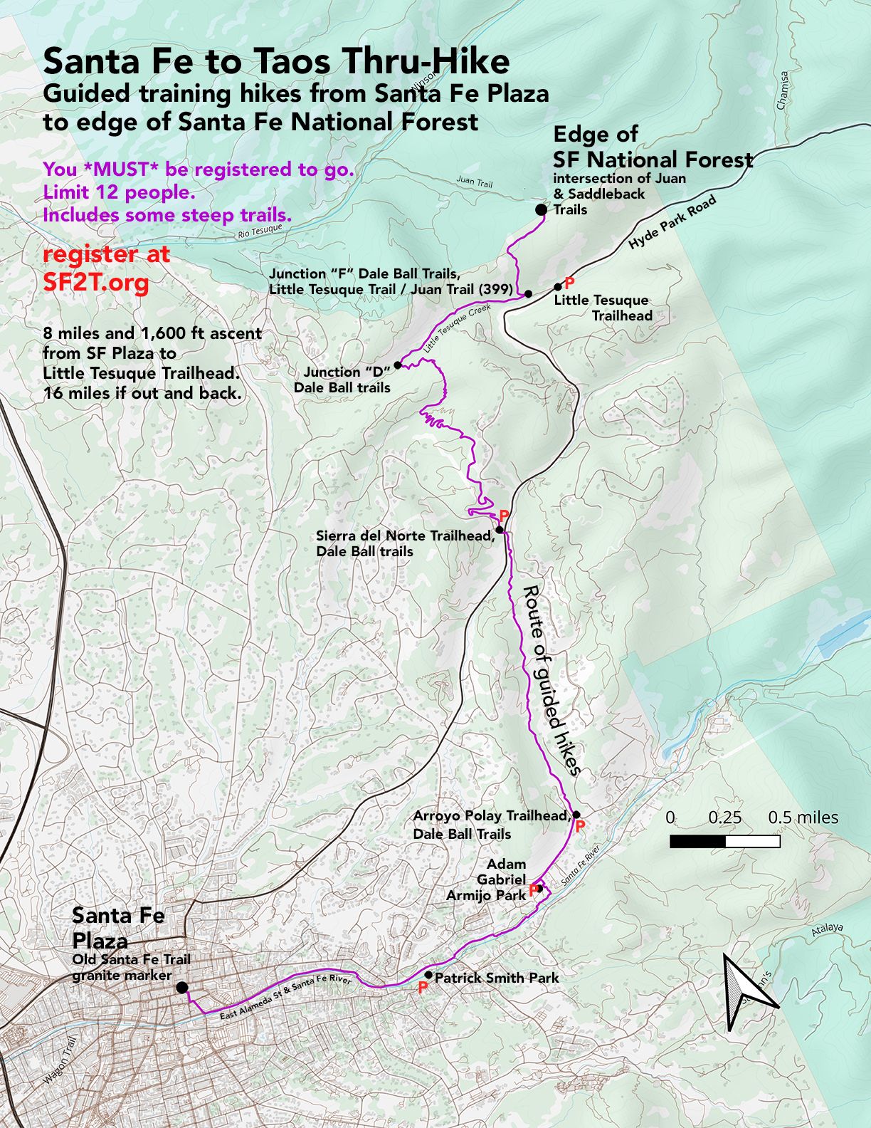Thanks to the helpful people at the City of Santa Fe and Santa Fe County land management offices, I can now offer guided hikes from Santa Fe Plaza to the edge of SF National Forest. By “the edge of SF National Forest”, I mean the Juan / Saddleback trails intersection at the top of the hill near Little Tesuque Trailhead.