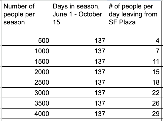 I made a little spreadsheet showing the number of possible hikers, the number of days in the SF2T season, and how many people that translates to on trail.