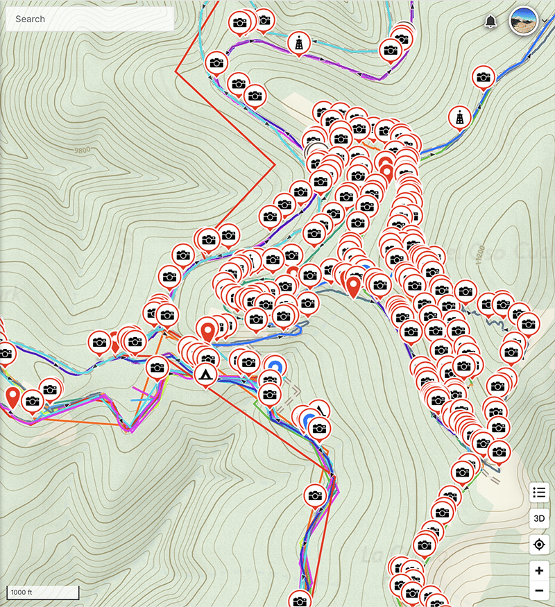 Here is one area of new Section 5. The lines of photos are me walking pretty much every single forest track in the area to determine which one is best for hiker traffic. Carson National Forest was logged “long ago”. It’s still being logged, legally or not - I have many photos of many cut trees, and quite a few of marked trees. The loggers build endless tracks in the forest. Some make for workable trails.