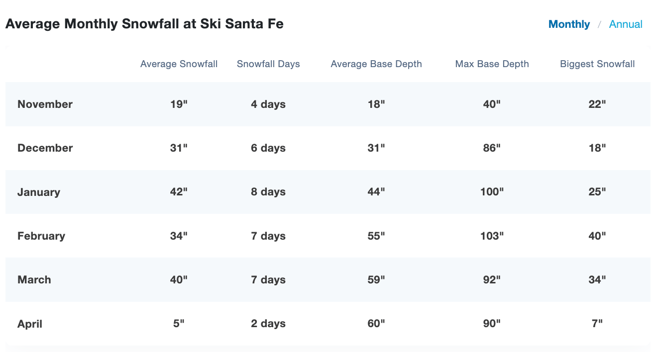 Santa Fe Ski Basin: 75 inches season total. Average is 161 inches.