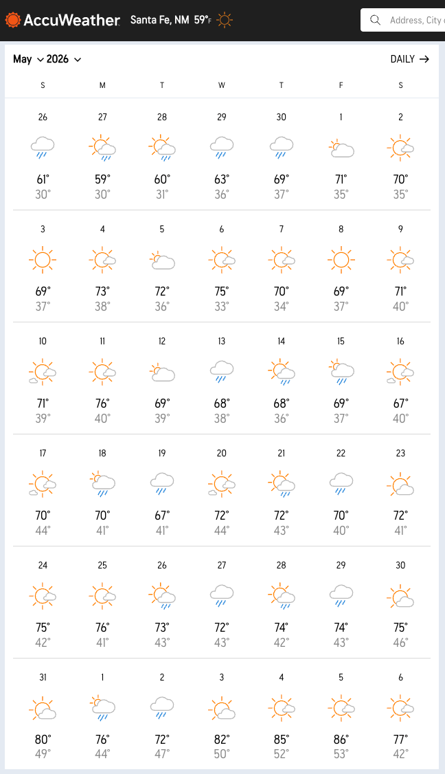 So… is this “just” Accuweather - and so far out that it’s a wild guestimate? Yeah. But still. Fingers crossed for a wet spring. This might quash doing SF2T “early” in May, because rain in Santa Fe is probably going to be snow above 11,000 feet. But who knows. I’ll keep reporting on what’s happening, and what the near-future weather predictions show.