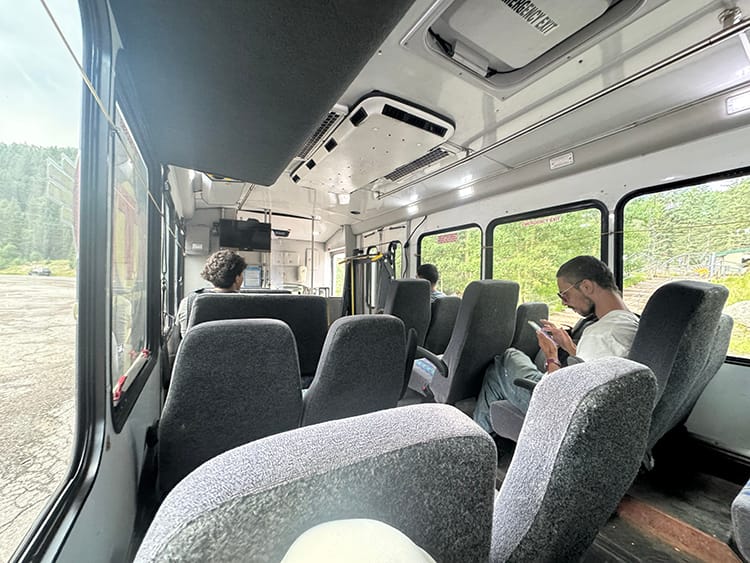 View from inside the Blue Bus, getting ready to drive down from the SF Ski Basin. It arrived a few minutes early, and took off right on time.